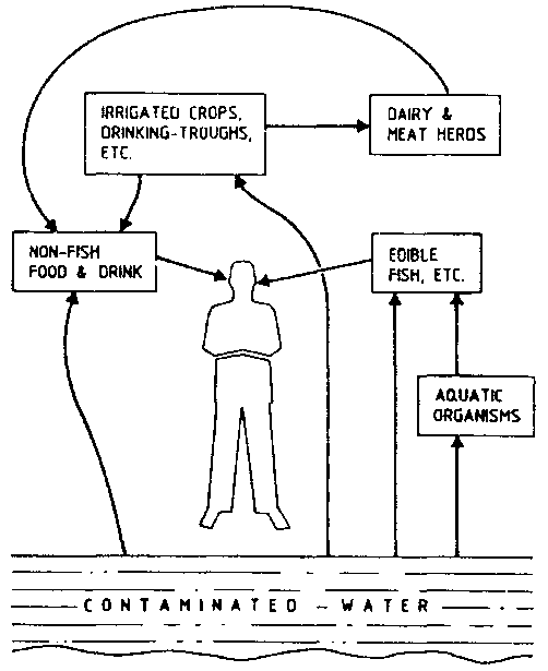 Fig.2 Principal pathways by which radioactive contaminants reach man from water.