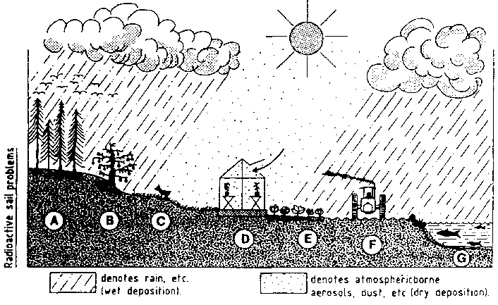 Radioactive fallout as "wet" or "dry" deposition over agriculture, forestry or fisheries is illustrated diagrammatically in Fig. 4 and summarized in the footnotes (see also part 2).