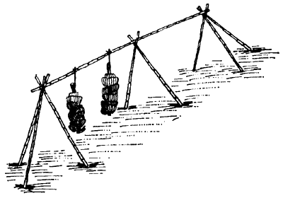 The bunches are tied to long poles supported by trestles.