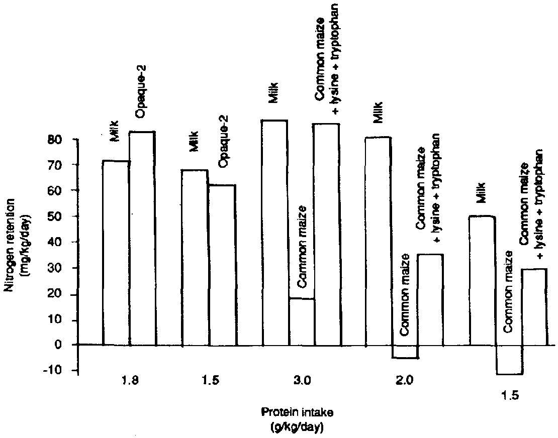 In a study by Luna-Jaspe, Parra and Serrano (1971) the nitrogen retention of common maize, Colombian opaque-2 maize (ICA H-208) and milk was compared in three children aged 24 to 29 months and weighing 5.9 to 10.1 kg. The protein and calorie intakes were approximately 1 g and 100 calories per kg body weight daily. Nitrogen retention was negative when the children received the opaque-2 maize. Common maize, however, gave an even lower or more negative figure. When milk was given, one child showed a negative balance and the other two a positive one, with the average balance on the positive side.