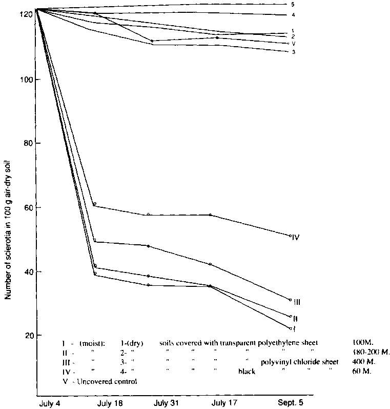 In contrast in dry soils, the loss of sclerotia numbers was few; 2.4-10.4 percent in tarped dry soils with clear plastic mulches, 1.6-4.8 percent in tarped treatment with black mulch, and about 1.6 percent in the control.