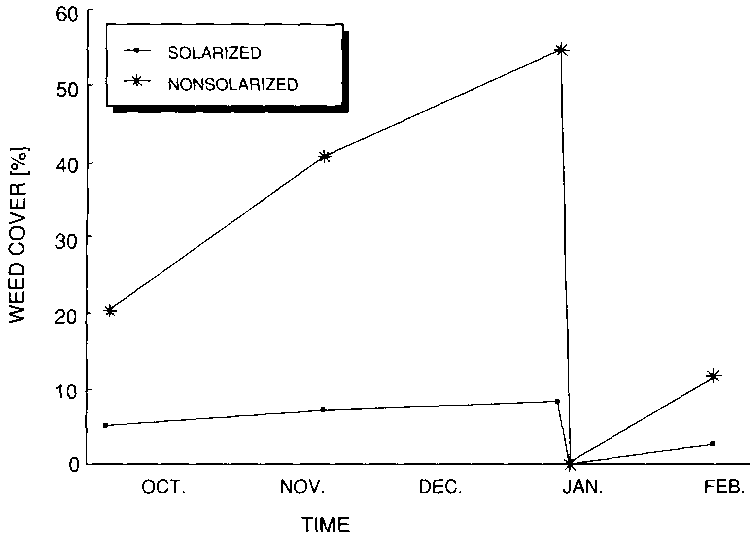 Weed and Orobanche Control. - Most weeds, especially annual weeds, were well controlled by solarization. Weed cover, exemplified in experiment 3, was 75.7 to 84.6 percent lower after solarization (Figure 1). Assessed in terms of weed dry weight, solarized plots had 82.1 percent lower weed infestation then non-treated plots (Table 4).