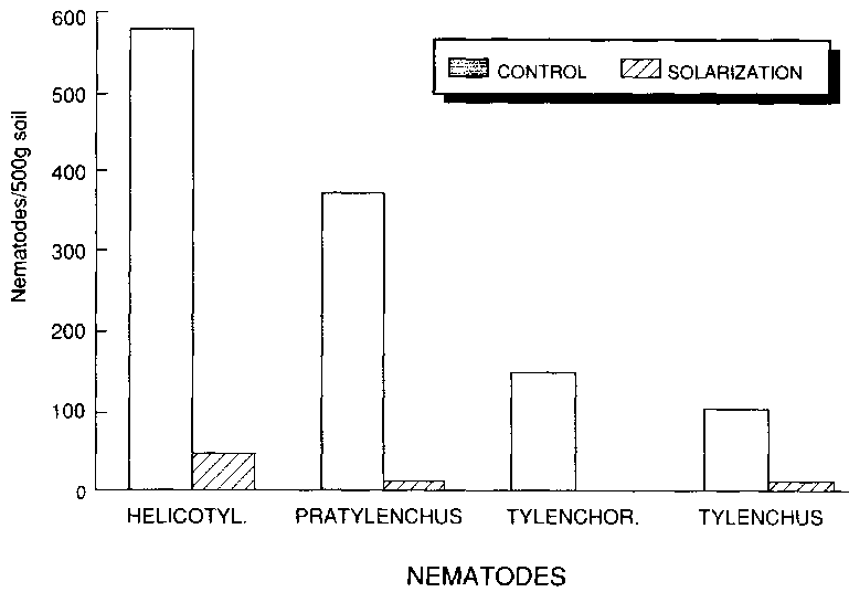 The population of free living nematodes, as also reported by Sauerborn et al. (12), was reduced by 83 to 100 percent after solarization, but the effect varied in different nematode species. This outcome confirms earlier findings on related nematodes (9, 14). In the case of Pratylenchus thornei, a reestablishment of the population could be noticed during the growing season.