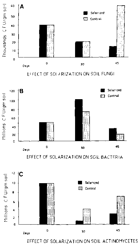 The results of the study showed that mulching of soil with polyethylene tarps during July and August significantly reduced soilborne fungi and phytoparasitic nematodes. As shown in Figure l, solarizing the soil for 45 days significantly reduced soilborne fungi, but 30 days of solarization had no effect on the population of soilborne fungi. Fusarium spp., causing cantaloupe wilt, Penicillium spp., Rhizopus spp. and Aspergillus spp. were identified. The bacterial population was significantly increased during the first 30 days in solarized and nonsolarized soil with 51.8 percent and 31.3 percent, respectively, as compared to the initial population; after 45 days the population decreased with 71 percent and 79 percent in solarized and non-solarized soil, respectively (Figure 2). Conversely, the Actinomycetes population was reduced during the first 30 days of solarization and increased after 45 days with 68 percent and 46.8 percent in solarized and non-solarized soil, respectively (Figure 3). Other studies showed that Bacillus spp. and many Actinomycetes and thermotolerant/ thermophilic fungi and other high temperature soilborne micro-organisms are prominent among the primary organisms recolonizing solarized soil.