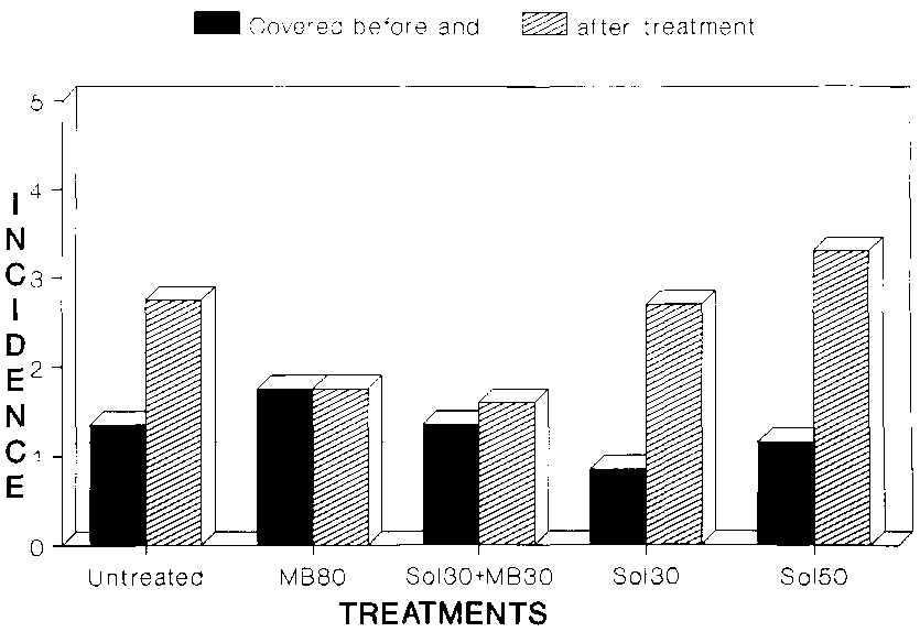 The incidence of corky-root disease (Fig. 2) in the plastic house covered after treating was in the range 2.7-3.3 percent in untreated and solarized plots and 1.6-1.7 percent in those fumigated with methyl bromide alone or in combination with soil solarization. This disease was less severe in the plastic house covered before treating (0.8-1.7 percent) and no significant differences were observed among the treatments.