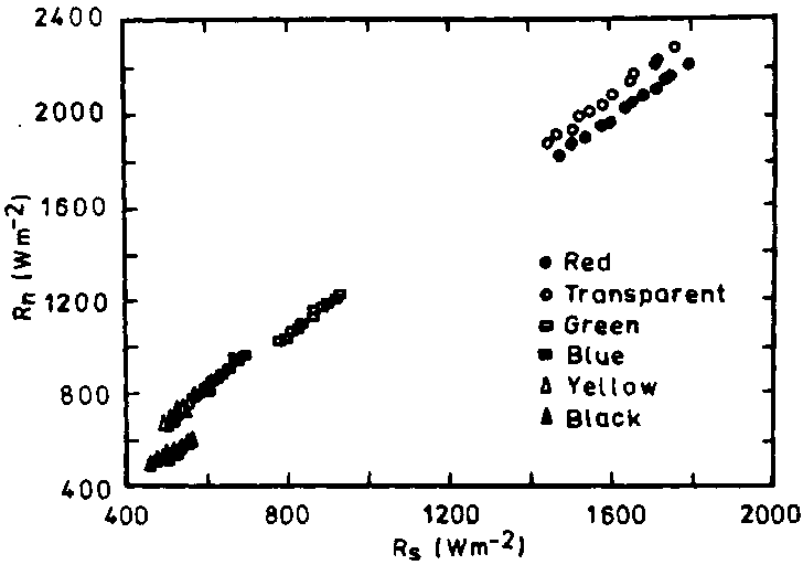 As the figure shows, the soil heat flux is closely related to the amount of radiation transmitted through the mulches. The best-fit line to the data points was obtained by the Hewlett-Packard linear regression analysis package. High values and even distribution of soil heat flux were found under red and transparent mulches. The soil heat flux under the rest of the mulches was strongly skewed toward lower values in the order of green > blue > yellow > black.