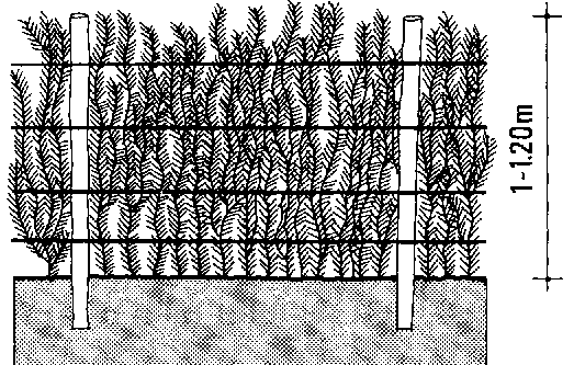 Plusieurs grillages synthétiques existent sur le marché. La pose du grillage nécessite l'utilisation de piquets en bois de 1,50 m de longueur et de 0,15 m de diamètre au fin bout. Ces piquets sont destinés a soutenir le grillage; ils sont enfouis jusqu'à 30 cm dans le sol et rattachés au grillage par du fil de fer recuit. Le bord inférieur du grillage est enfoui sur 10 a 15 cm dans une levée de terre de même hauteur pour empêcher tout affouillement de la base de la palissade (figure 18).