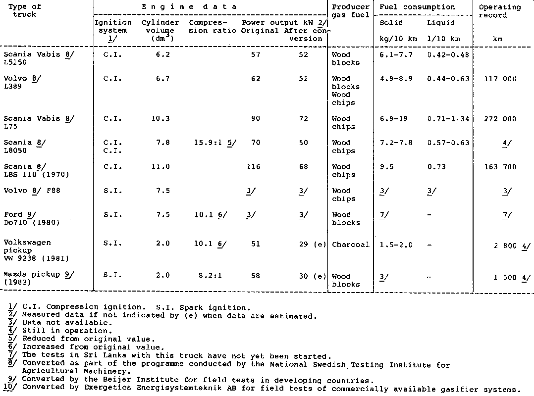 Producer gas was used as a substitute fuel for almost all the vehicles operated in Sweden during the Second World War. Some improvements of the gasifier and the gas cleaning technology have been made since then. This does not necessarily mean that producer gas is still a realistic option for substitution of petroleum fuels in case of a supply crisis. The current engines are different from those used in the forties and so are the vehicles. For an assessment of the present possibilities of producer gas, it is therefore important to collect and evaluate experiences from operation of modern vehicles with this fuel. Tables 3.10 and 3.11 list tractors and trucks converted to producer gas in Sweden after the Second World War. The majority have been converted and tested by the National Swedish Testing Institute for Agricultural Machinery, and have been used for practical operation for several years, monitored by the Institute. These tests have been concentrated on dual fuelling of compression-ignition engines. The operating experience now covers more than 65000 km for trucks and 15000 hours for tractors.