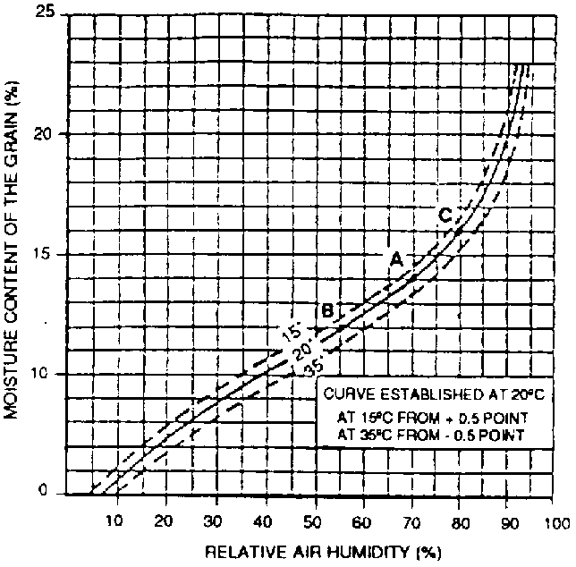 For a certain category of products and for a given temperature, an equilibrium in the exchange of water vapour between the grain and the air is represented by the curve called "hydroscopic equilibrium curve".