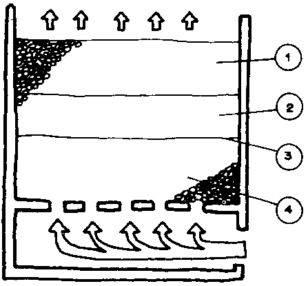 Diagram of the drying process: 1 Humid grain; 2 Drying area; 3 Drying front: 4 Dry grain.