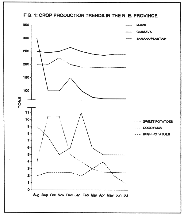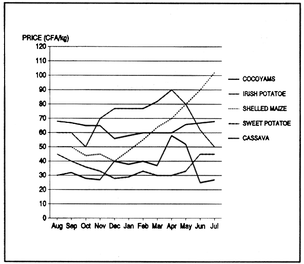Feed prices can only be low if the prices of the feedstuffs which make up the feed are low. Feedstuffs should therefore be obtained when prices are low and stored for use when needed. Figures 1 and 2 (MIDENO, 1984; FAO-PFLRP, 1990) show that prices are low shortly after harvest in Cameroon. Other means of reducing the cost of feed include the use of unconventional crops produced in excess of human demand, possibly during seasonal gluts, as substitutes for more expensive or unavailable feed items. The development of such technologies could then be adopted in the field.