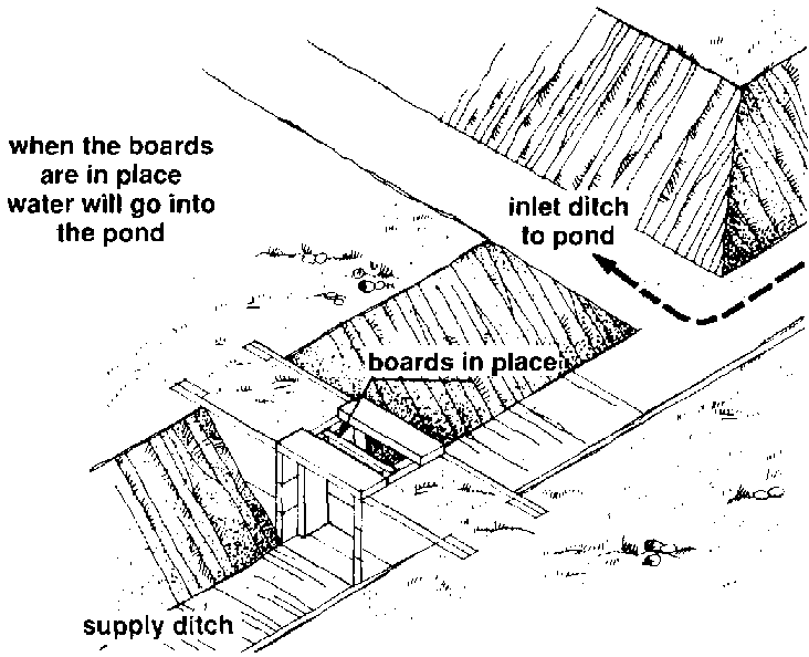 156 When you have built your ditches, you will need a way to control the flow of water from the stream into your supply ditch and from your supply ditch into the inlet ditches of each of your ponds.