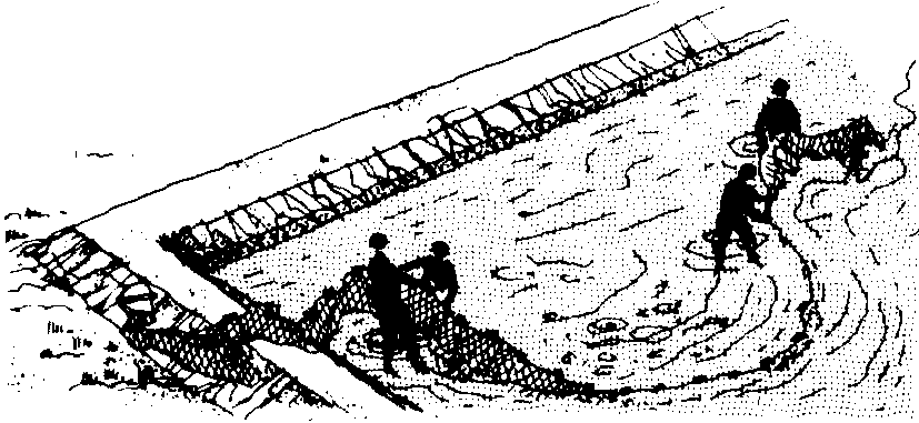 316 Start at the deep end of the pond and pull the seine net slowly toward the shallow end. The drawing shows you how.