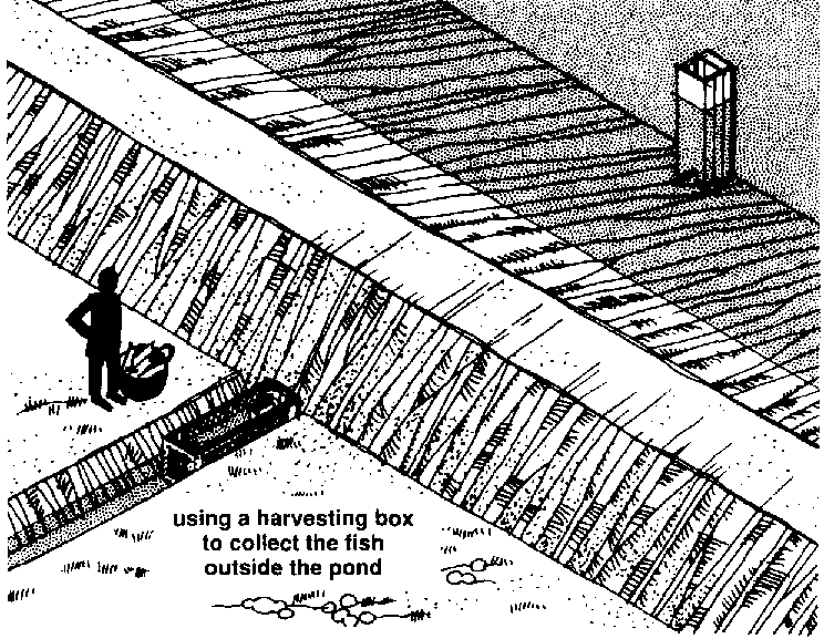 333 When you are ready to harvest your fish, put the harvesting box in the outlet ditch outside your pond at the end of the pipe from the monk. Make sure that the pipe is well inside the harvesting box so that the fish will not get out.
