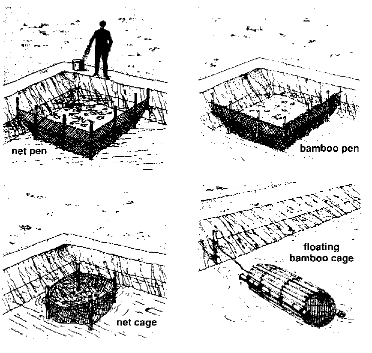 342 If you have another pond that is full of water, you can put these baby fish in a pen of split bamboo or net in the corner of the other pond. You can also keep these baby fish in a net pen or in a fish cage (see items 368 to 375 and 435 to 439).