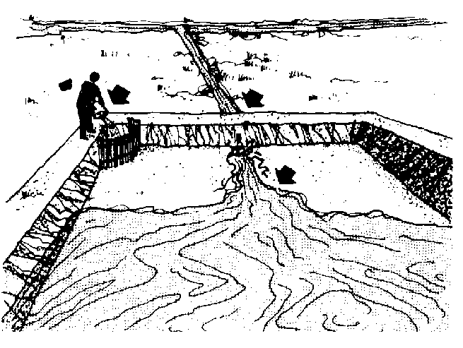 355 If there are any water leaks in the banks or around the inlet, outlet or overflow, stop them by packing them with good clay soil.