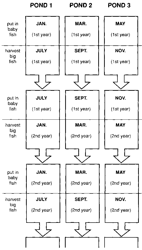 360 If you have three ponds and a good supply of baby fish, you can stock each pond in a different month and harvest each pond six months later. The diagram on the next page will show you how to harvest and stock three ponds.