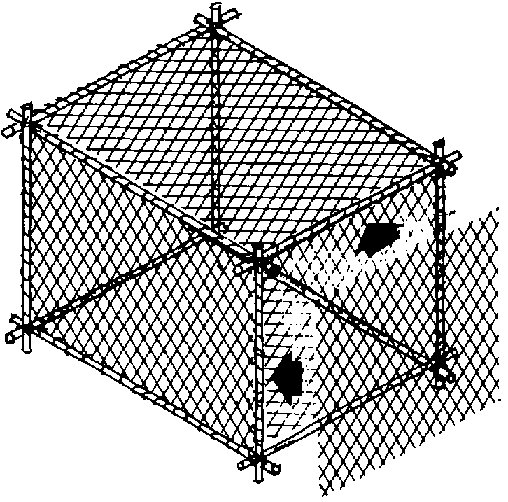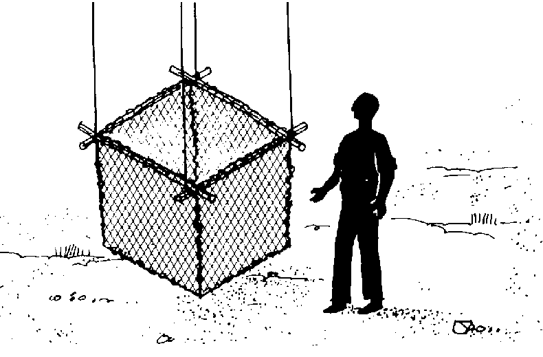 461 If you have used fishing net or woven material, tie a length of rope to the bottom of each corner to be used to attach weights when the cage is in the water.