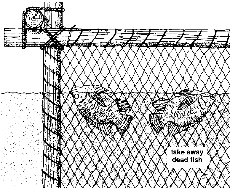 446 You can also build a simple cage by putting a square float on the water and hanging a piece of fish net inside.