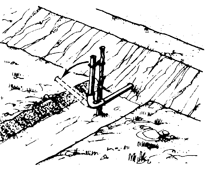 113 Vous pouvez construire un autre type d'écoulement pour vidanger plus rapidement un grand étang. Ce dispositif est installé dans la digue de l'étang du côté profond. Ce type d'écoulement est appelé moine. Quand l'étang est rempli le moine se trouve dans l'eau.