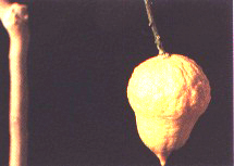Field symptoms range from mild bark cracking to very severe bark scaling, primarily on trifoliate and Rangpur lime rootstocks, accompanied by various degrees of stunting of the tree (see Figures 35-37 and 43). For more detailed descriptions and photographs see Weathers (1980) and Wallace (1978). Both Rangpur lime and trifoliate orange twigs and branches may show a chlorotic stem blotching which is symptomatic (Figure 38). Citrons are highly susceptible and, when inoculated, may show bark cracking (Figure 41b), leaf epinasty and necrosis of the leaf veins (Figure 41a). Sweet limes and certain lemon varieties may show elongated bark cracks. Certain mechanically inoculated herbaceous hosts, i.e. Gynura, petunia and tomato, will show a distinct leaf curl, epinasty and vein necrosis. Trees on trifoliate hybrid rootstocks can be stunted to varying degrees (Figure 43) and some of these hybrid rootstocks will show bark cracking. Trees on trifoliate rootstock affected with both exocortis and tristeza can be very severely stunted. Trifoliate orange rootstock infected with individual or combinations of CVs (excluding CEV) may show mild to moderate bark cracking (Figure 37). Occasionally CEV can induce stunted, acorn-shaped fruits on citron or Volkamer lemon (Figure 39) (Bitters, Duran-Vila and Semancik,1987).
