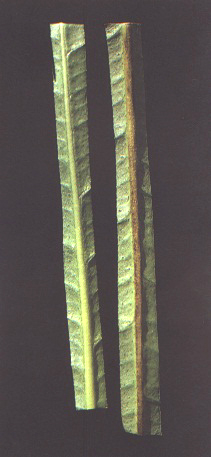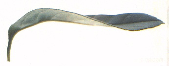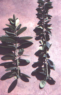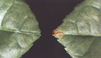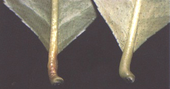 Leaf symptoms for the milder-reacting citrus viroids are tip browning (Figure 42a), petiole wrinkle and browning (Figure 42b), midvein browning (Figure 42c), and mild leaf epinasty (Figure 42d; also Roistacher et al.,1977). Petiole wrinkle may occur without browning. However, as the plant matures, browning of the petioles on the lower leaves becomes more pronounced and distinct. Leaves of the non-inoculated control plants grown with proper nutrition, temperature and watering will show no petiole wrinkle or browning (Figure 42b, right). As mentioned earlier, these symptoms are very mild and will be seen only under the best conditions of growth and temperature. They will not be seen if temperatures are too cool (Figure 40). They may not be seen in seedlings, and seedlings should not be used for detection of these milder-reacting citrus viroids (Roistacher et al.,1977).