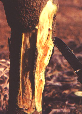 For photographs and a description of field symptoms of cachexia, see Childs (1959,1980) and Calavan and Christiansen (1965). The diagnostic symptoms in tangelo, mandarin or C. macrophylla are phloem discoloration by gumming, undulating stem pitting or bumps and projections on the bark, which fit into depressions in the wood. Gum spots are usually prominent in the bark and are readily seen by slicing sections through the bark with a knife (Figures 44 and 45). The presence of these typical symptoms on susceptible hosts in the field can be diagnostic for the disease since very few graft-transmissible diseases of citrus show these classical symptoms, especially in tangelos, mandarins, Rangpur limes or C. macrophylla.