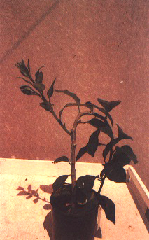 FIGURE 52b Graft-inoculated satsuma seedlings inoculated with SDV. Non-inoculated control plant is on the left. Note the smaller-sized plants and spoon-shaped leaves. Photo taken by M. Miyakawa eight weeks after inoculation (Japan)