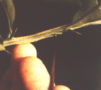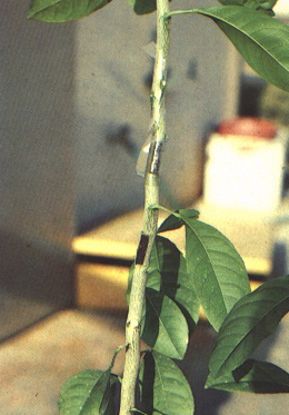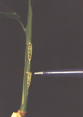 Budsticks are collected from the field tree to be indexed and should be placed in a plastic bag, cooled in an ice chest and refrigerated at the laboratory until used. The bud or blind bud is sliced or cut from a stem or budstick. Using a well-sharpened knife, a slice is made into the stem using a continuous slicing motion. The bud should be cut free of the stem with one smooth slicing stroke. A T-cut is then made into the stem of the receptor or index plant to be inoculated. The upper portion of the bark at the top of the T-cut is opened and the bud or blind bud inserted (similar to the illustration in Figure 130). The blind bud is an excellent inoculum tissue and is preferred since it is easier to excise from a budstick and has the advantage of not having an eye, thus avoiding growth of the inoculum bud after the wrapping is removed. It is inserted in the same manner as the bud with an eye.