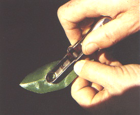 Of prime importance in grafting techniques is a good-quality budding knife. New knives must be sharpened using a medium-grit carborundum stone so that every trace of the original V-shaped tip on the cutting edge of the new blade is removed. When the cutting edge is observed with a magnifying glass, a smooth transition from the back of the blade to the very edge should be seen. The blade should be razor-sharp. The test for a well-sharpened blade is the ability to make a single, smooth slicing cut into the budstick and detach the bud or blind bud clear of the budstick without tearing the tissue as the cut is completed. The knife should be periodically resharpened with a fine-grit oilstone using oil, and honed on a leather strap. It is well to observe a number of professional or skilled budders to study their techniques and practice under their tutelage.