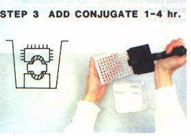 3. Add enzyme-antibody conjugate diluted in conjugate buffer to an optimum concentration (normally between 1/500 and 1/5 000) (Figure 143). Incubate 2-4 h at 37°C. Wash at least three times with PBST to remove unbound conjugate from the wells.