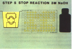 5. Add substrate freshly prepared at a 0.6 to 1 mg/ml concentration in substrate buffer (10 percent diethanolamine, pH 9.8). Incubate until strong colour change develops in positive controls (normally 30-60 min) and read plates. Plates may be read at several intervals without stopping the reaction, so rate of reaction can be calculated, or the reaction stopped at an appropriate time by addition of 3 M NaOH and a single reading made. If plates are read visually, score estimated relative strength of reaction. If read on a spectrophotometer or plate reader, record the OD405 values.