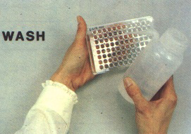 Proper washing of the plates between steps is important. The standard procedure is to wash the plate three times between each step with phosphate-buffered saline (PBS) containing 0.5 percent Tween 20 (PBST). Sodium azide is frequently included in PBST solutions as a preservative. However, it is highly poisonous and may form an explosive complex with some metals. It is unnecessary to use sodium azide in ELISA wash solutions and it should be omitted. The two most critical wash steps are after sample incubation when cross-contamination must be avoided between wells containing different samples (omit the first wash immediately if carry-over between wells occurs) and after the conjugate incubation step. If even a minor residue of unattached conjugate remains, high background readings may occur (add another wash at this point when in doubt). Various plate washers are available which can promote consistent washing operations, but a plastic squeeze bottle will work well for small volumes of plates (Figure 154). Solutions in the plate wells can be removed by aspiration to avoid contamination, but usually the plate is inverted rapidly with a quick shake of the hand and tapped firmly on clean blotting paper or paper towels.