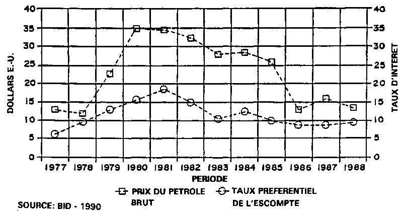 A la fin des années 70, une série de facteurs ont contribué à déclencher ladite crise de la dette extérieure. La montée accélérée des prix internationaux du pétrole et la chute de celui des matières premières d'exportation dans les pays en développement, ont provoqué une grave détérioration des termes de l'échange. De plus, l'inflation enregistrée dans le monde industrialisé, qui, en augmentant le coût de l'argent, a réduit la circulation monétaire, a entraîné une remontée spectaculaire des taux d'intérêt appliqués aux prêts octroyés aux pays en développement au cours des années précédentes; l'intérêt réel des prêts s'est ainsi trouvé multiplié. Le graphique 2.1 ci-après met en évidence le lien existant entre la variation du taux préférentiel de l'escompte (prime rate) et celle du cours du pétrole sur le marché international.