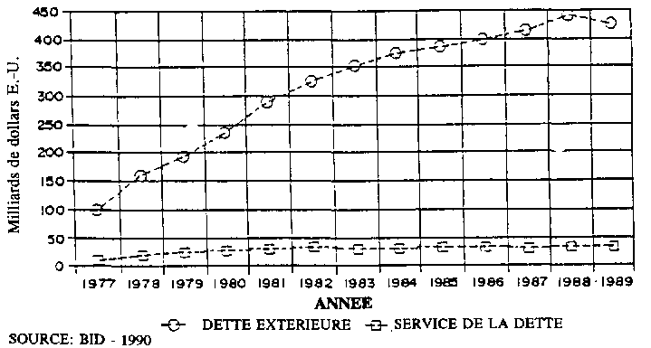 C'est en Amérique latine, la région la plus endettée du tiers monde, que les effets de ce déséquilibre se sont manifestés avec le plus de vigueur. Selon l'estimation la plus récente (1989), la dette totale de la Région s'élève à 419 milliards de dollars E.-U.2 Les résultats négatifs ne se sont pas faits attendre: ne serait-ce qu'entre 1982 et 1985, les investissements régionaux ont reculé de 40 pour cent et sont restés stagnants depuis, sauf dans quelques rares cas. Ce phénomène a eu des répercussions sur le niveau de vie et, dans certains pays, les indicateurs socio-économiques montrent un recul de 10 ans. Comme l'indique le graphique suivant, les paiements effectués au titre du service de la dette sont restés constants tandis que la dette extérieure de l'Amérique latine augmentait.