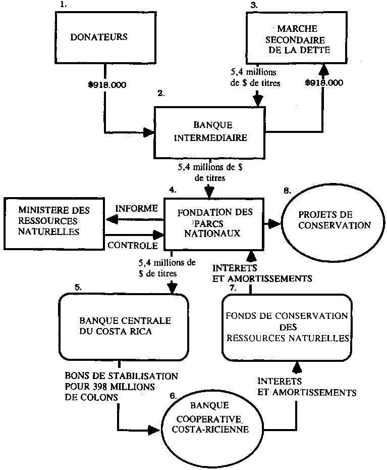 La Figure 2.1 ci-après illustre le mécanisme de la première conversion de la dette à des fins écologiques, qui s'est déroulée au Costa Rica, et met bien en évidence le flux des ressources, de et vers les diverses organisations.