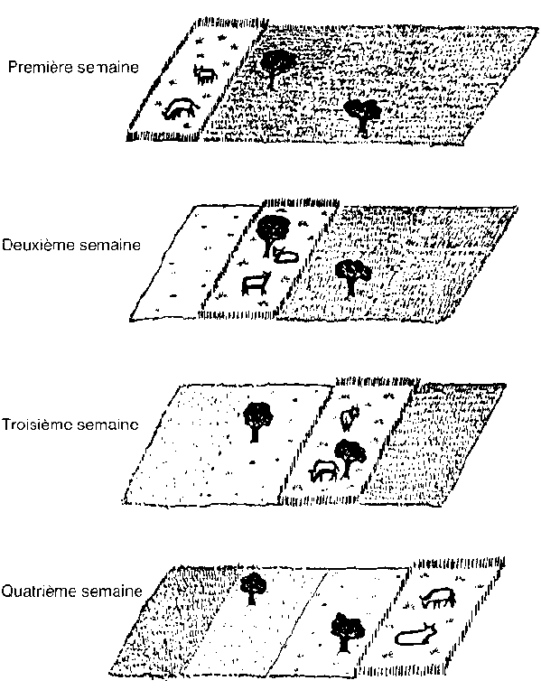 · Le pâturage tournant favorise une nouvelle pousse des plantes fourragères pour les animaux. Il permet à la prairie de reposer assez longtemps pour que les herbages produisent de bonnes racines et graines.