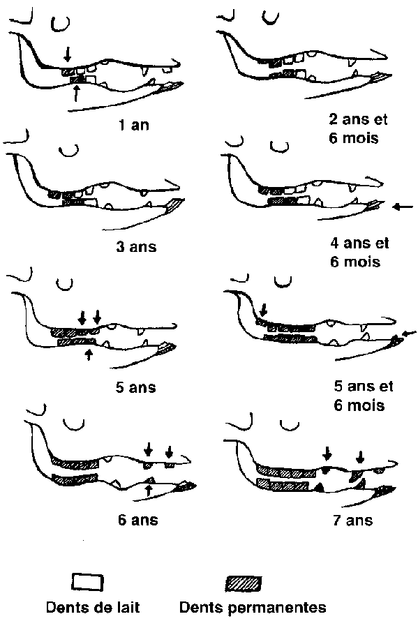 Il y a 34 dents permanentes. Elles sont plus grandes que les dents de lait et disposées comme suit: