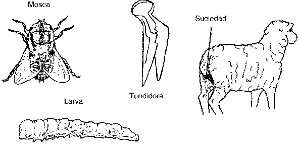 Las ovejas pierden de forma natural su lana en los meses cálidos, por lo que antes de que esto ocurra se esquilan para recuperarla y emplearla en múltiples usos. Si la lana está sucia, por excrementos y humedad, atrae a las moscas que depositan en ella sus huevos. Estos dan lugar a larvas que se alimentan de la carne de la oveja. |
