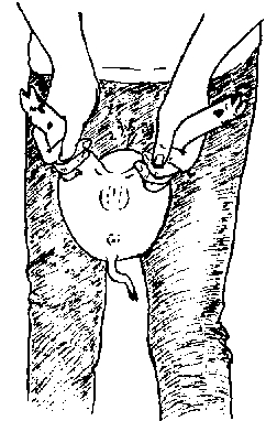 Necesitará que alguien le sujete el lechón para castrarlo. Se sujetará de las extremidades posteriores teniéndolo cabeza abajo y el cuerpo firmemente sujeto entre las piernas del ayudante.