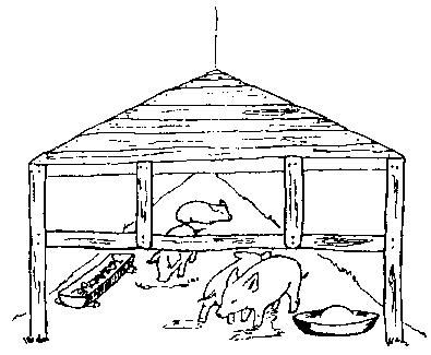 Al edificar la porqueriza se elegirá una zona que nunca se inunde en la estación lluviosa. No debe estar cerca de las casa para que no molesten ni los olores ni las moscas. El suelo debe ser de cemento e inclinado para que la orina fluya lejos y hacia afuera desde la zona donde duermen los animales. I a capa de cemento descansará sobre una buena cimentación y tendrá 5-6 cm. de espesor. Si el cemento es demasiado delgado y se agrieta, los cerdos pronto comenzarán a levantarlo. El suelo de tierra no puede mantenerse limpio y provocaría problemas con los parásitos y ciertas enfermedades. Las paredes de las cochiqueras deben ser lisas para poder mantenerlas limpias. Las grietas de las paredes permiten que se acumule la suciedad y los gérmenes.
