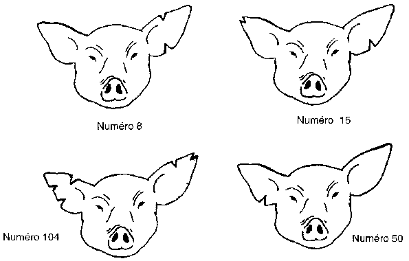 Si tiene pocos cerdos u otros animales, el identificarlos no es problema. Los identificará observándolos y hasta podría poner nombre a cada uno. Necesitará en cambio algún medio de identificar cuando el número de animales es elevado, sobre todo si piensa llevar un archivo de los mismos (véase Anexo 5). Hay muchas maneras de identificar los animales, por ejemplo, con collares numerados, tatuajes y chapas de plástico. Las muescas de las orejas constituyen una forma fácil y la más barata.