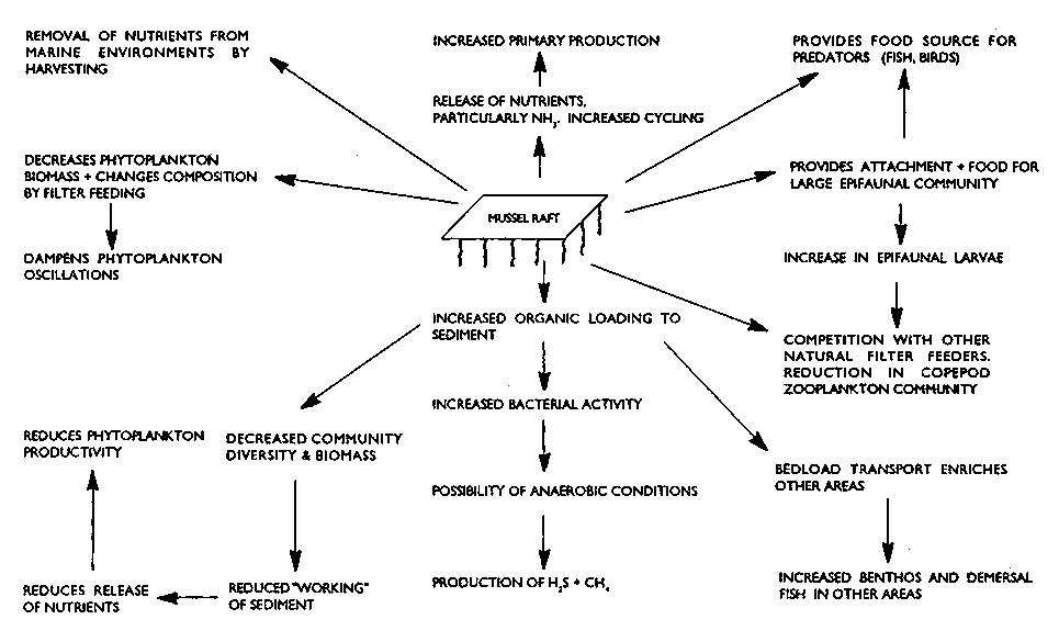 27. Benthic communities beneath suspended culture may be affected in various ways (Kaspar et al., 1985). Macrofauna may be lacking entirely in the area directly under the culture site. Around the culture site, species richness is reduced and opportunistic enrichment-tolerant species become predominant. Crabs changed their diet and became abundant as a response to mussel culture in northwest Spain (Freire et al., 1991), where transport of organic material derived from farms was shown to enhance benthic macrofauna biomass beyond the area of the coastal embayment. Based on a literature review, Gowen et al. (1988) summarized the possible ecological effects of mussel raft farming (see Figure 2).