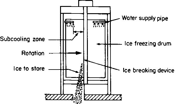 Flake ice. This type of machine forms ice 2 to 3 mm thick on the surface of a cooled cylinder and the ice is harvested as dry subcooled flakes usually 100 to 1,000 mm² in area. In some models, the cylinder or drum rotates and the scraper on the outer surface remains stationary. In others, the scraper rotates and removes the ice from the surface of a stationary drum, in this case, built in the form of a double-wailed cylinder. It is usual for the drum to rotate in a vertical plane but in some models the drum rotates in a horizontal plane. One distinct advantage of the rotating drum method is that the ice-forming surfaces and the ice release mechanism are exposed and the operator can observe whether the plant is operating satisfactorily (Fig. 1 1). The machine with the stationary drum has the advantage that it does not require a rotating seal on the refrigerant supply and takeaway pipes. However, this seal has been developed to a high degree of reliability in modern machines. The ice is subcooled when harvested, the degree of sub-cooling depending on a number of factors but mainly the temperature of the refrigerant and the time allowed for the ice to reach this subcooled temperature. The subcooling region of the drum is immediately before the scraper where no water is added for a part of the drum's rotation and the ice is reduced in temperature. This ensures that only dry subcooled ice falls into the storage space immediately below the scraper. The refrigerant temperature, degree of subcooling and speed of rotation of the drum are all variable with this type of machine and they affect both the capacity of the machine and the thickness of the ice produced.