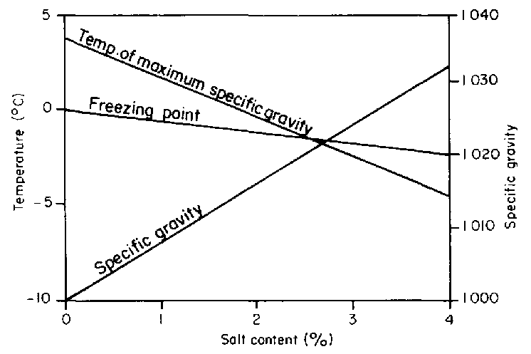 Pure water has a density of 1 kg/l and this maximum value occurs at a temperature of 4.0°C. The density of salt water and the temperature of maximum density vary, as shown in Table 12, and the freezing point of seawater also changes with salinity. With high salinities, lower storage temperatures are possible but care should be taken to guard against slow freezing of the fish for the reasons given in Chapter 1.