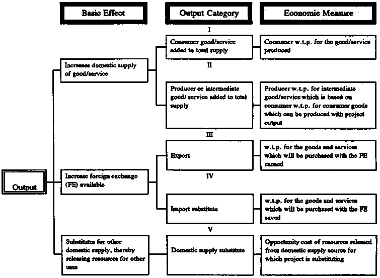 For analytical purposes, project outputs can have three types of effects (see figure 5.2). First, a project output can increase the total domestic supply of a good or service available to society. This produces two categories of outputs (see output categories I and II in figure 5.2): (1) consumer goods or services, and (2) intermediate or producer goods or services (i.e., project outputs which will serve as inputs in other production processes which produce consumer goods). In the former case, the appropriate measure of value is the consumers' w.t.p. for the output of the project itself. In the latter case, the appropriate value measure is producers' w.t.p. for the project output, which in turn is based on consumers' w.t.p. for the other goods and services which will be produced with the output from the project being analyzed.