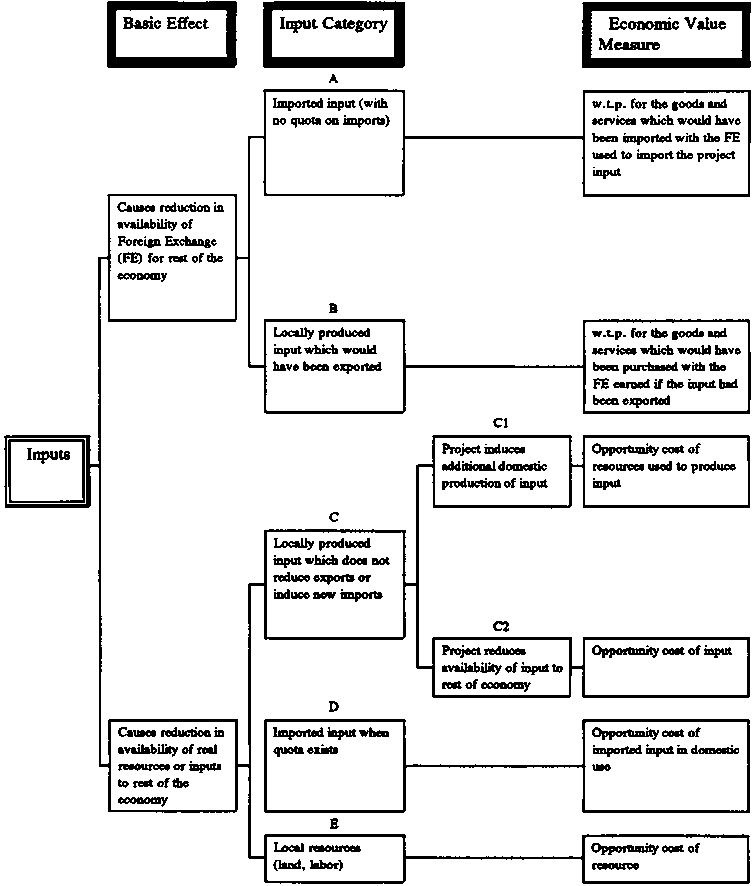 Inputs used in a project can have two basic economic effects (figure 5.3). They can: (1) reduce the availability of foreign exchange for the rest of the economy, and (2) reduce the availability of real resources or inputs to the rest of the economy. A reduction in the availability of foreign exchange may result from use of imported inputs when no quota exists, or from the use of locally produced input which otherwise would have been exported (input categories A and B in figure 5.3). Where inputs are imported (input category A), the appropriate measure of opportunity cost is based on the w.t.p. for the goods and services which could have been bought with the foreign currency or foreign exchange spent on the imported inputs for the project. This category also includes project use of a locally produced input in short supply that forces a previous user of the input to import the input. In either case - direct use of imported input or forcing someone else to import it - the effect is the same, and so is the value measure that is appropriate.