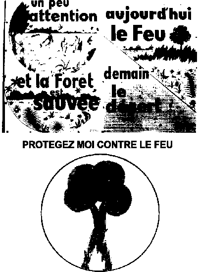 * Tout d'abord, I'attention des élèves est éveillée par un concours de dessin: l'instituteur et ses élèves essaient d'éteindre un feu menaçant la plantation de l'école ou un père et ses enfants protègent leur récolte à l'approche d'un feu de brousse.