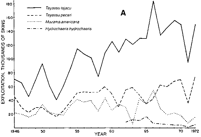 Data on the impact of commercial hunting are virtually confined to before and after accounts of how abundant the resource was prior to the advent of hunting, and how scarce thereafter (16, 44, 259, 378, 397, 451, 488, 533, 611). The 1946-1972 skins and hides export data from the Peruvian Amazon (245, 479) do allow certain tentative generalizations to be made, however (Figures 1a and 1b). While the statistics in both Figures 1a and 1b show a certain amount of fluctuation, the herbivore hide export figures do remain fairly constant or tend slightly upward, particularly for Tayassu tajacu. The increase may well reflect an increased hunting effort linked to population growth, new hunting areas and a rising demand for food (245). The commercial bushmeat hunters who generally work along rivers are now striking 10 to 15 km inland from the shore in search of game (573). Herbivorous mammals are hunted primarily for food, bushmeat constituting approximately 80 percent of the total value of game products in the Peruvian Amazon (163), and the skins are a side item. No alarming slumps have been observed except possibly for Mazama, but gradual resource depletion is predictable as hunting expands with population growth.