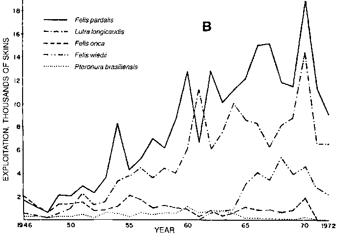 Few carnivores were hunted for their skins during the 1940s (mostly Pteronura and Felis pardalis), but the figures spiralled dizzyingly upwards thereafter, particularly for Felis pardalis and Lutra longicaudis (apparently partly to replace Pteronura, kills of which decreased after 1955). Felis wiedi appears in the statistics from 1961 onwards and ranks third by 1965, though this may be a by-product of organized hunting for the more valuable felids (543). During the last two years the total of all kills has dropped. Commercial hunting of carnivores for the export skin trade has been banned in Peru since 1972.